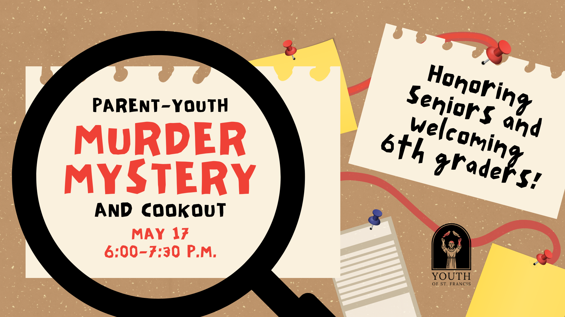 Bring the whole family for this fun end-of-the-year celebration! We will have dinner, honor our outgoing seniors, give out prizes like Acolyte of the Year, and play a lively game of Murder Mystery!